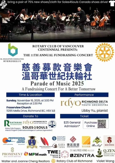 The event took place on November 16, 2025, at Fraserview Church, bringing together Rotary members, youth volunteers, families, and partner organizations in support of several charitable causes. This year’s beneficiaries included Ratanak International, Rotary’s Polio initiatives, Interact youth programs, and the Soles4Souls Canada shoe drive.